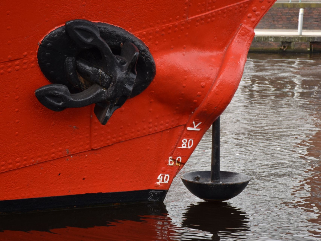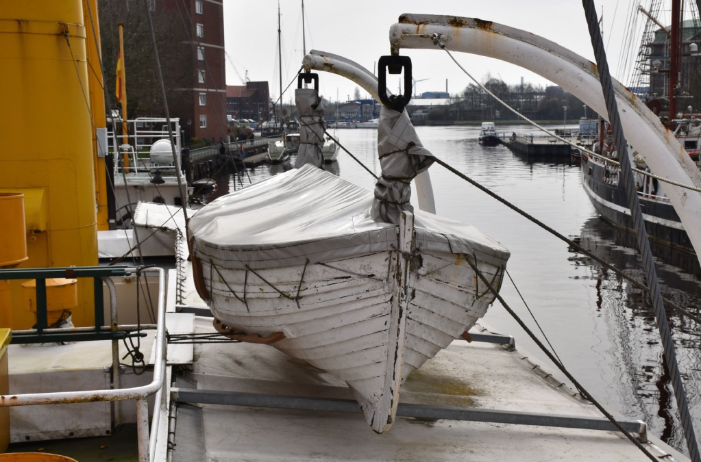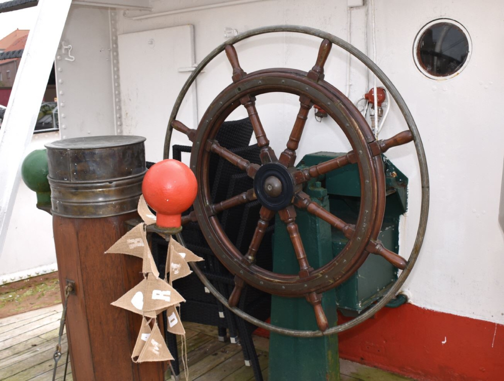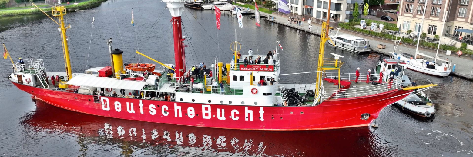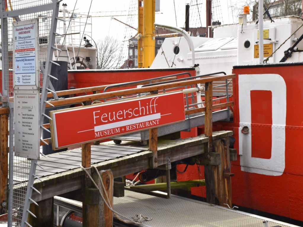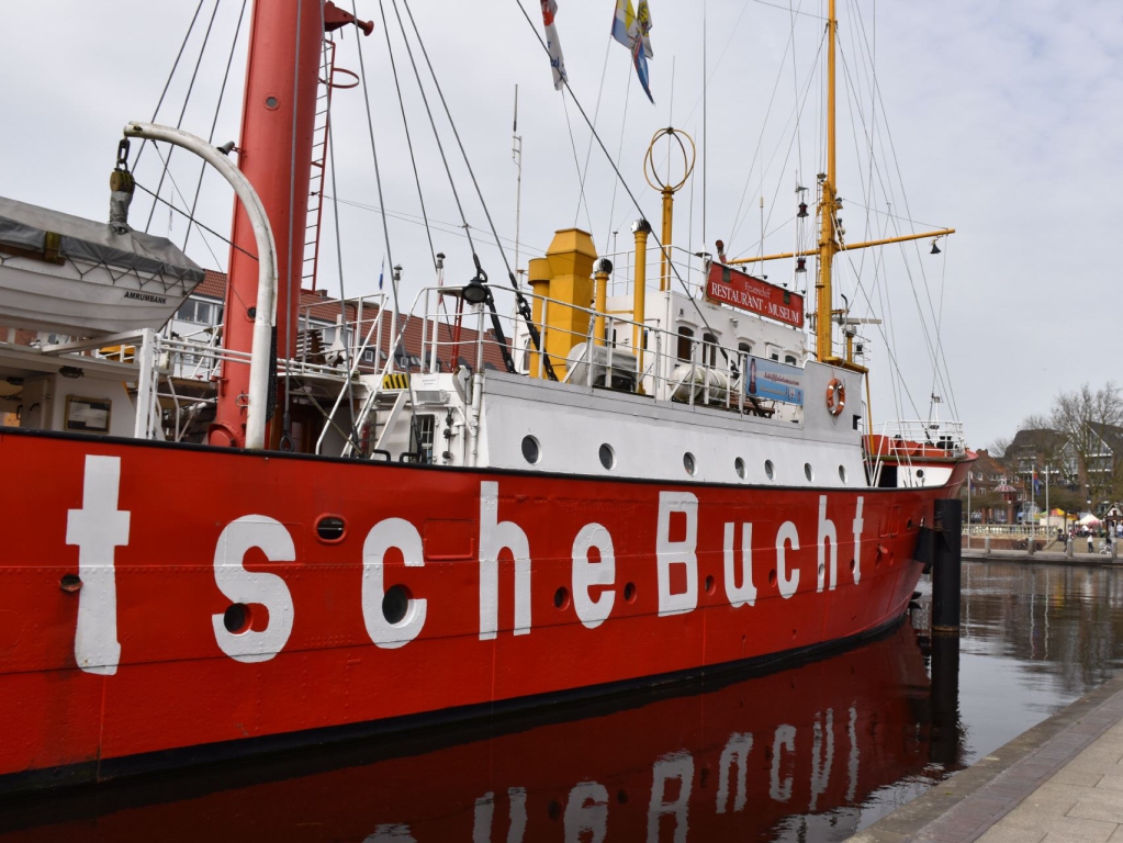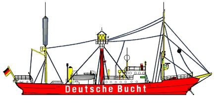 Die Beschriftung Deutsche Bucht an den beiden Bordwänden des Schiffes weist auf den letzten Liegeplatz als aktives Feuerschiff hin. 12 Besatzungsmitglieder taten im 14-tägigen Wechsel ihren Dienst an Bord.